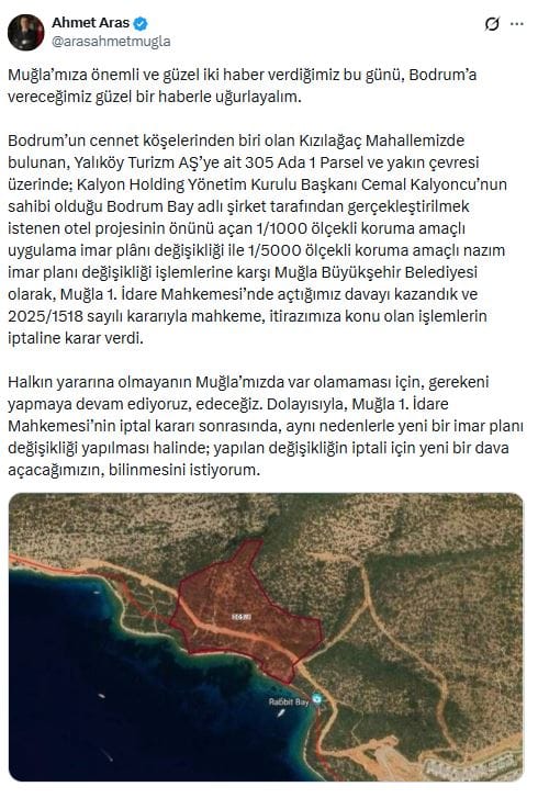 "YENİ BİR İMAR PLANI DEĞİŞİKLİĞİ YAPILMASI HALİNDE..."Kararı sosyal medya hesabından duyuran Muğla Büyükşehir Belediye Başkanı Ahmet Aras, sürecin takipçisi olduklarını ifade etti.