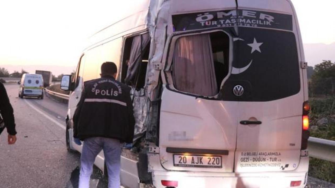 Edinilen bilgilere göre, Afyonkarahisar'ın Dazkırı ilçesine tarım işçilerini taşıyan Hacı Avcı yönetimindeki 20 AJK 220 plakalı minibüs, işçi almak için emniyet şeridinde beklemeye yaptı. O esnada arkadan gelen H.K. idaresindeki 34 KL 6085 plakalı kamyon servis aracına çarpmamak için manevra yapsa da etkisi olmadı.