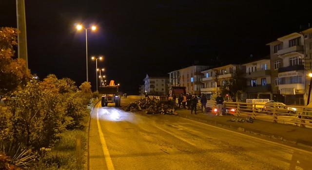 Kamyondan kara yoluna dökülen odunlar kaldırıldı