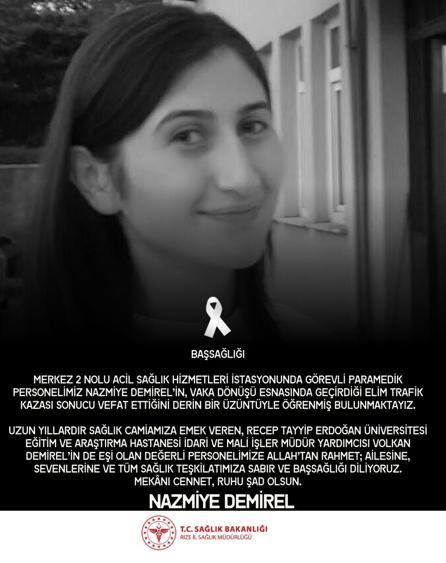 Çarpışmanın şiddetiyle yere düşen sağlık görevlisi, ağır yaralandı. Yaralı sağlık personeli ambulanstaki arkadaşlarının ilk müdahalesi sonrası Recep Tayyip Erdoğan Eğitim ve Araştırma Hastanesi'ne kaldırıldı. Ağır yaralı olarak kaldırıldığı hastanede tedavi altına alınan 3 çocuk annesi Nazmiye Demirel, 5 gündür verdiği yaşam mücadelesini kaybetti. Rize İl Sağlık Müdürlüğü de yaşamını yitiren Demirel için taziye mesajı paylaştı.