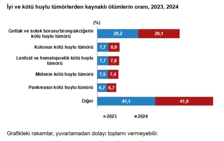 GIRTLAK VE AKCİĞER KAYNAKLI TÜMÖRLER İLK SIRADATümörden kaynaklı ölümlere en çok gırtlak ve soluk borusu/bronş/akciğer tümörü neden oldu.