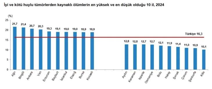 İyi ve kötü huylu tümörlerden kaynaklı ölümler illere göre incelendiğinde, 2024 yılında bu hastalıklara bağlı ölüm oranının en yüksek olduğu ilin %21,7 ile Ağrı olduğu görüldü. Bu ili %21,4 ile Bingöl, %20,7 ile Ankara, %20,3 ile Van izledi.