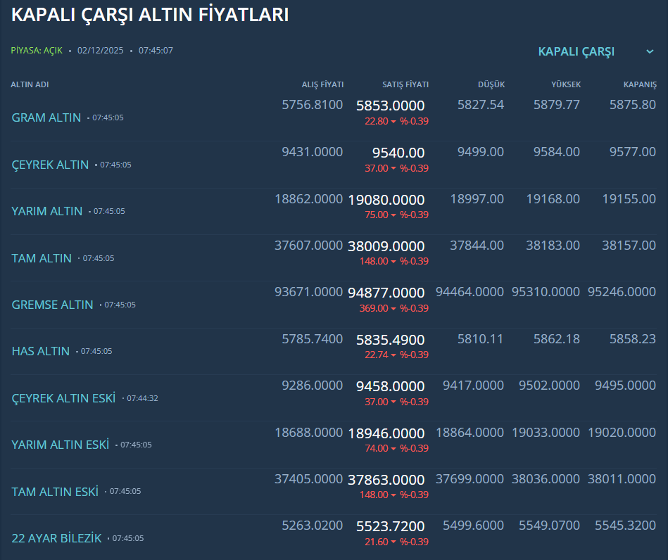 Kapalı Çarşı'da altının alış-satış fiyatları arasındaki makas 100 liraya yaklaştı. Gram altın 5 bin 850 liradan satılırken alış fiyatı ise 5 bin 754 lira oldu. İşte Kapalı Çarşı'daki altın fiyatları: