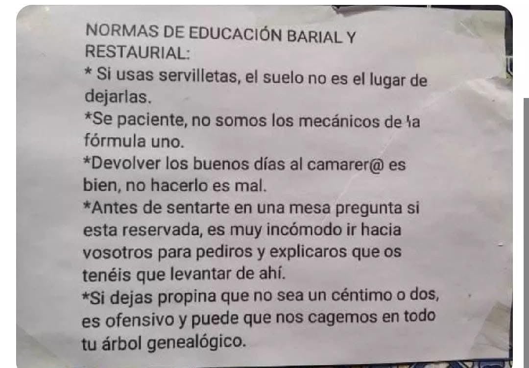 "Soy Camarero" (Ben Garsonum) adlı sosyal medya hesabından paylaşılan ve bir işletmenin kapısına asılan "Davranış Kuralları" listesi, interneti birbirine kattı.
