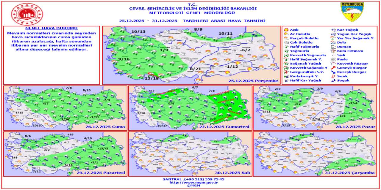 Mevsim normalleri civarında seyreden hava sıcaklıklarının cuma gününden itibaren azalacağı, hafta sonundan itibaren yer yer mevsim normalleri altına düşeceği tahmin ediliyor.
