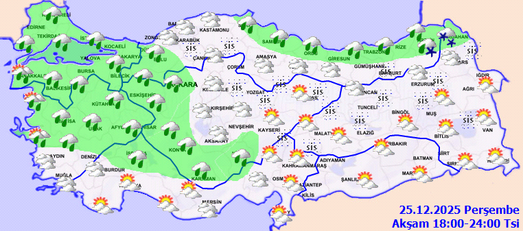 Türkiye genelinin parçalı, yer yer çok bulutlu, Marmara, Ege, Batı Akdeniz, İç Anadolu’nun güney ve batısı, Orta ve Doğu Karadeniz kıyıları, Zonguldak, Düzce, Bolu ve Sinop çevreleri ile Kastamonu'nun kıyı, Mersin'in batı kesimlerinin yağmur ve sağanak, Artvin ve Ardahan çevrelerinin karla karışık yağmur ve kar yağışlı geçeceği tahmin ediliyor.