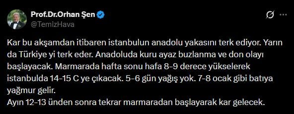 "Kar bu akşamdan itibaren istanbulun anadolu yakasını terk ediyor. Yarın da Türkiye yi terk eder. Anadoluda kuru ayaz buzlanma ve don olayı başlayacak. Marmarada hafta sonu hafa 8-9 derece yükselerek istanbulda 14-15 C ye çıkacak. 5-6 gün yağış yok. 7-8 ocak gibi batıya yağmur gelir. Ayın 12-13 ünden sonra tekrar marmaradan başlayarak kar gelecek."