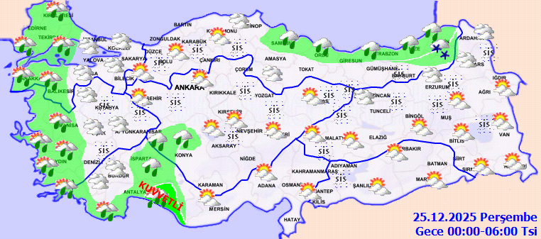 METEOROLOJİ 'KUVVETLİ' NOTUYLA İL İL UYARDIMeteoroloji Genel Müdürlüğü tarafından yapılan tahminlere göre; ülkemiz genelinin parçalı yer yer çok bulutlu, Marmara'nın batısı, Kıyı Ege, Batı Akdeniz, Orta ve Doğu Karadeniz kıyıları ile Manisa, Yozgat, Sivas, Tokat, Sinop, Artvin çevreleri, Denizli'nin batısı, Konya'nın kuzey ve batısı ile bu sabah saatlerinde Zonguldak ve Bartın çevrelerinin yağışlı geçeceği tahmin ediliyor.