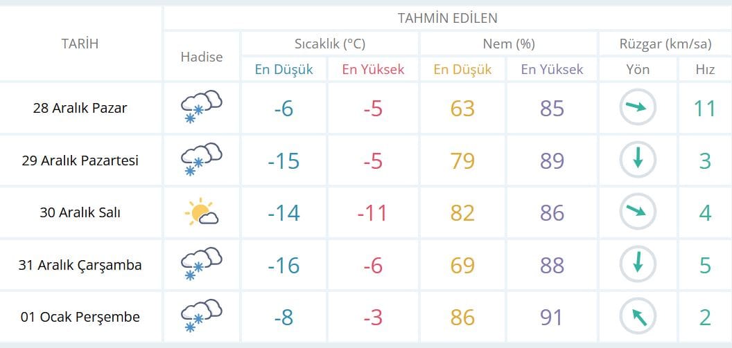 AĞRI'DA HAVA DURUMUMeteoroloji Genel Müdürlüğü verilerine göre Ağrı'da 5 günlük hava durumu şöyle:
