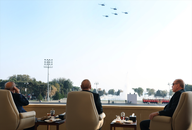KARABAĞ ZAFERİNİN YIL DÖNÜMÜ KUTLANDIAzadlık Meydanı'ndaki töreni Azerbaycan Cumhurbaşkanı İlham Aliyev, Cumhurbaşkanı Recep Tayyip Erdoğan ve Pakistan Başbakanı Şahbaz Şerif birlikte izledi. Tören, üç ülkenin milli marşlarının çalınması ve 44 günlük savaşta şehit olan askerler için bir dakikalık saygı duruşuyla başladı.