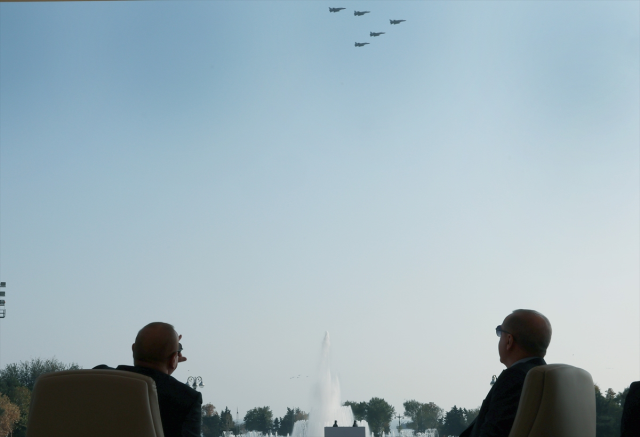 ERDOĞAN VE ALİYEV TÜRK F-16'LARINI İZLEDİZaferin yıl dönümünde tarihi görüntüler kaydedildi. Cumhurbaşkanı Erdoğan ve Azerbaycan Cumhurbaşkanı İlham Aliyev, Türk F-16'larının geçişini izledi. O anlar objektiflere yansıdı.