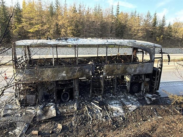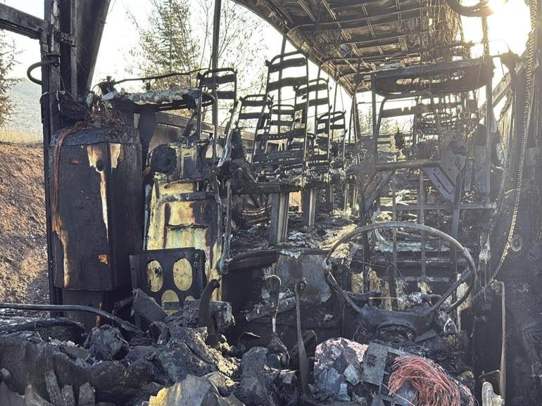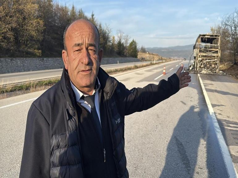 Baktım araç motor kısmından yanmaya başladı. Yolcuyu tahliye ettim, itfaiyeyi aradım. Sağ olsun jandarma geldi, polis geldi, itfaiye geldi, AFAD geldi. Gördüğünüz gibi araç bu durumda. Herhangi bir can kaybı yok. 30 kişi vardı. Hepsini tahliye ettik, personelde dahil. Ama aracı kurtaramadık" dedi.