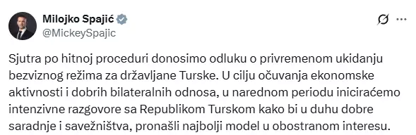 "KARARI ACİL BİR PROSEDÜRLE ALACAĞIZ"Spajic, X hesabından yaptığı açıklamada "Türk vatandaşları için vizesiz rejimin geçici olarak askıya alınmasına ilişkin kararı acil bir prosedürle alacağız. Ekonomik faaliyetlerin ve iyi ikili ilişkilerin korunması amacıyla, önümüzdeki dönemde Türkiye Cumhuriyeti ile yoğun görüşmeler başlatarak, iyi iş birliği ve müttefiklik ruhu içinde her iki tarafın da çıkarına olacak en uygun modeli bulmaya çalışacağız" ifadelerini kullandı.