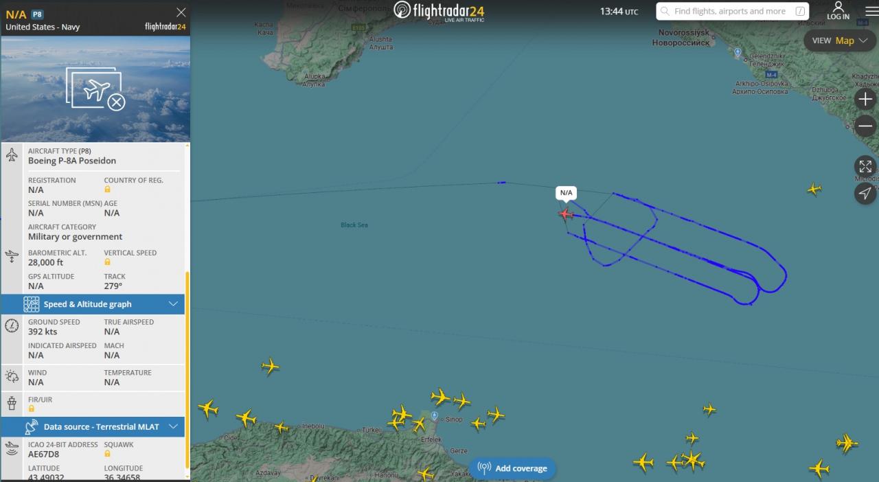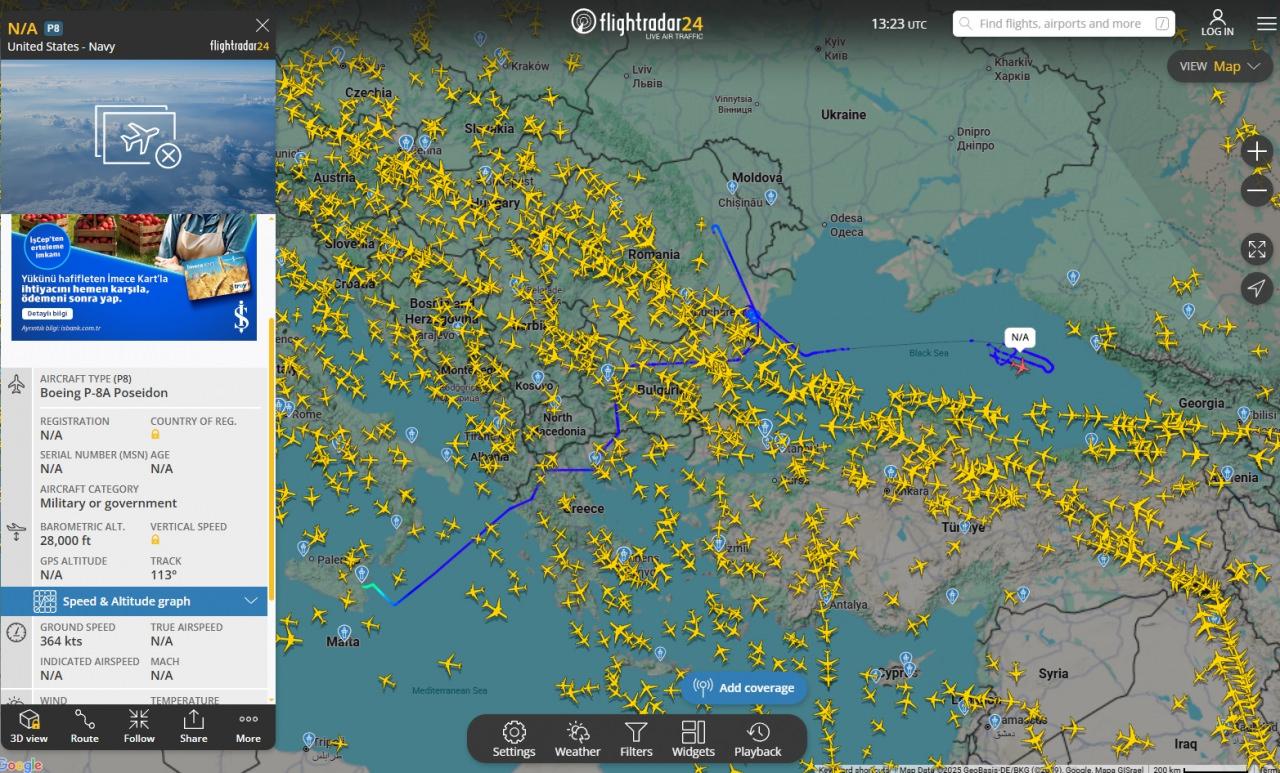 Romanya'nın başkenti Bükreş yakınlarında sortiler atan Boeing P-8A Poseidon, ardından ise Karadeniz'e yöneldi. ABD'nin en gizli radar sistemlerinden biri olan AN/APS-154 Gelişmiş Havadan Algılama Sensörünü (AAS) taşıyan Poseidon şu anda Karadeniz üzerinde sortiler attığı tespit edildi.