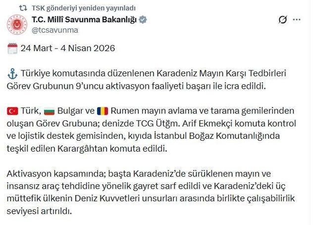 Bakanlığın sanal medya hesabından yapılan açıklamada, "Türkiye komutasında düzenlenen Karadeniz Mayın Karşı Tedbirleri Görev Grubu’nun 9’uncu aktivasyon faaliyeti başarı ile icra edildi. Türk, Bulgar ve Rumen mayın avlama ve tarama gemilerinden oluşan Görev Grubuna; denizde TCG Üsteğmen Arif Ekmekçi komuta kontrol ve lojistik destek gemisinden, kıyıda İstanbul Boğaz Komutanlığında teşkil edilen karargahtan komuta edildi. Aktivasyon kapsamında; başta Karadeniz’de sürüklenen mayın ve insansız araç tehdidine yönelik gayret sarf edildi ve Karadeniz’deki üç müttefik ülkenin Deniz Kuvvetleri unsurları arasında birlikte çalışabilirlik seviyesi artırıldı" ifadelerine yer verildi.
