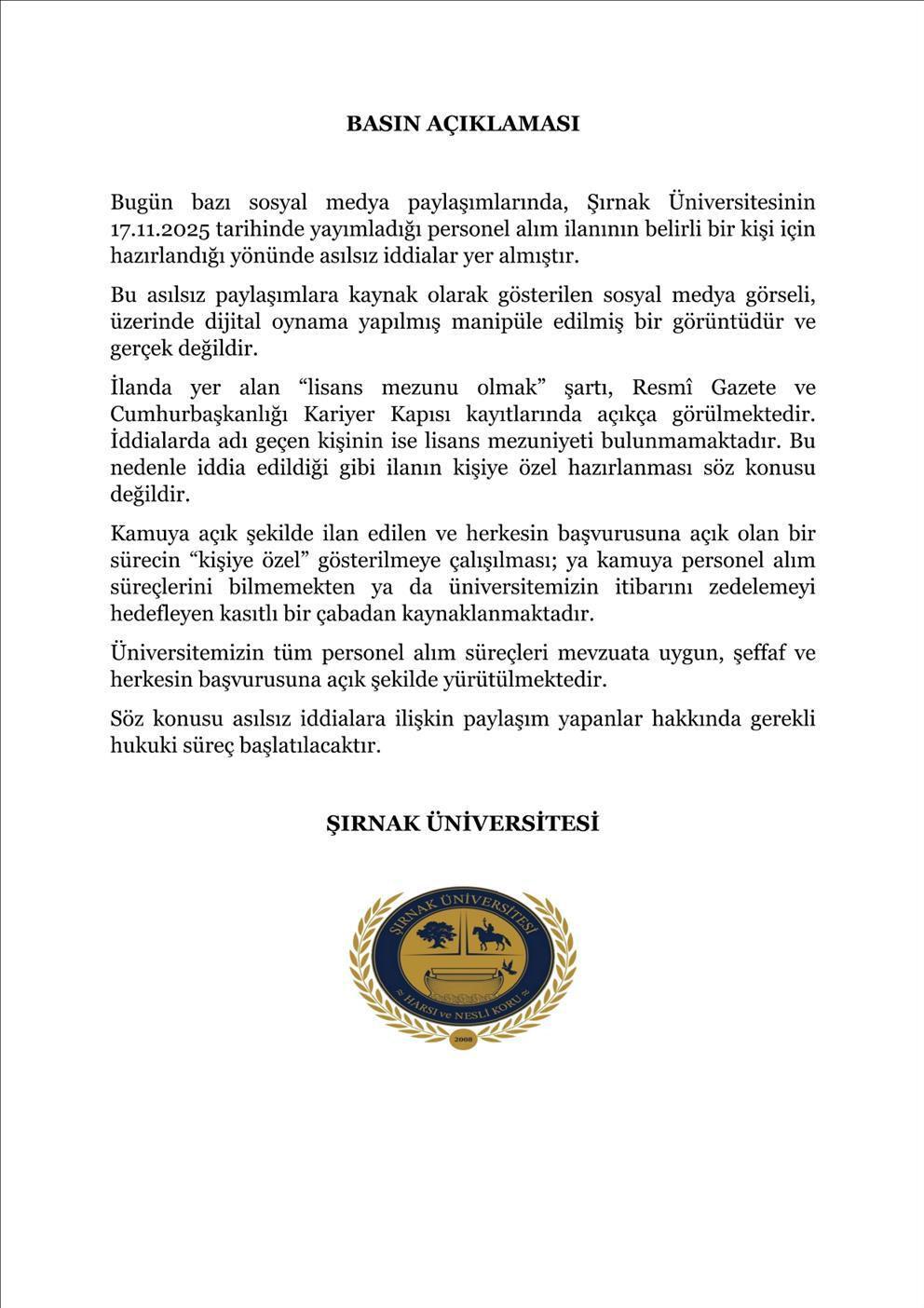 "Bugün bazı sosyal medya paylaşımlarında, Şırnak Üniversitesinin 17.11.2025 tarihinde yayımladığı personel alım ilanının belirli bir kişi için hazırlandığı yönünde asılsız iddialar yer almıştır. Bu asılsız paylaşımlara kaynak olarak gösterilen sosyal medya görseli, üzerinde dijital oynama yapılmış manipüle edilmiş bir görüntüdür ve gerçek değildir.
