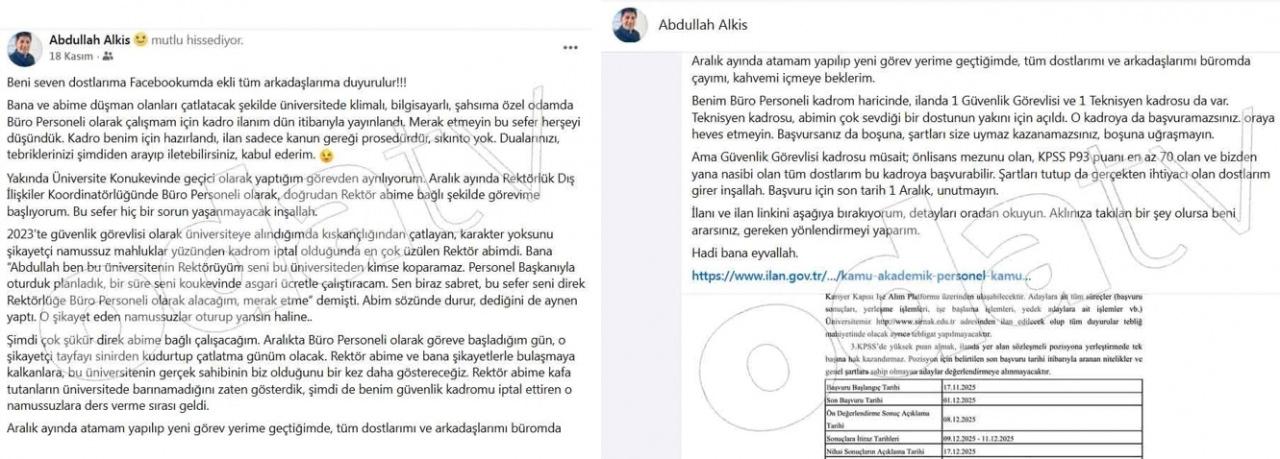Şırnak Üniversitesi Rektörü Üniversite Rektörü Prof. Dr. Abdurrahim Alkış’ın kardeşini kurumda büro personeli olarak istihdam edebilmek için özel kadro açtığı iddia edildi. Rektörün kardeşi Abdullah Alkış’ın sosyal medya hesabı üzerinden “özel kadro” ilanını paylaştığı ve kendisine özel kadro açıldığını itiraf ettiği öne sürüldü. Alkış’ın “Aralık ayında atamam yapılıp yeni görev yerime geçtiğimde, tüm dostlarımı ve arkadaşlarımı büromda çayımı, kahvemi içmeye beklerim.” ifadelerini kullandığına dair ekran görüntüleri paylaşıldı.