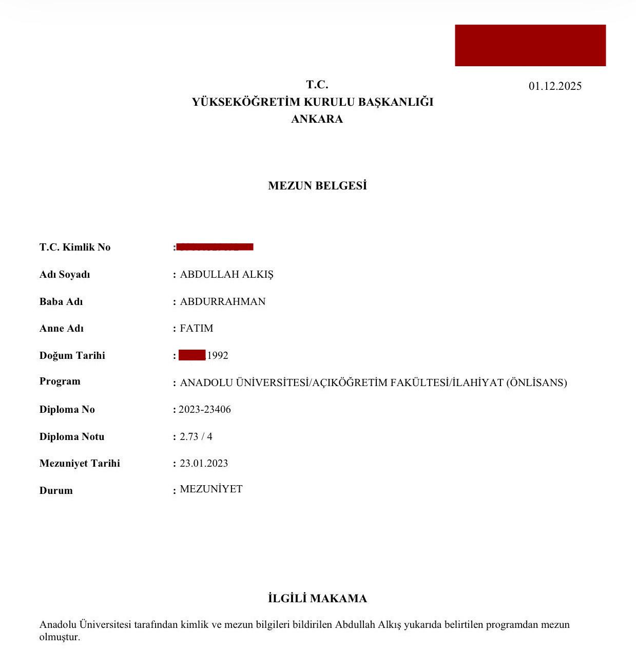 Eskişehir Anadolu Üniversitesi Açıköğretim Fakültesi İlahiyat mezunu olduğunu belirten Alkış, "Ben ön lisans mezunuyum, böyle bir paylaşım yapılmadı. Üzerime iftira atıldı. Paylaşımın ChatGPT'den yapıldığını düşünüyorum" dedi.
