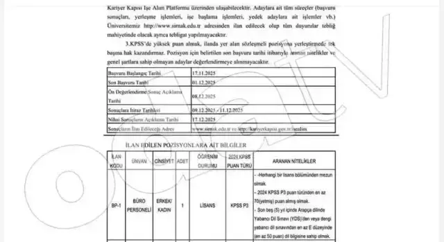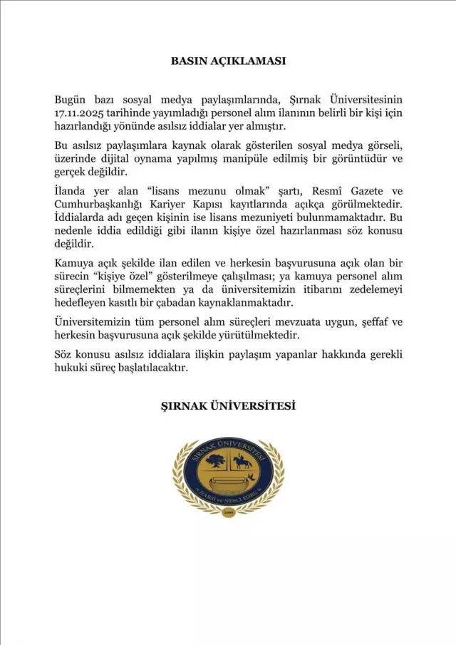 ÜNİVERSİTEDEN RESMİ AÇIKLAMAŞırnak Üniversitesi'nden resmi açıklama ile söz konusu iddialar kesin dille reddedildi. Yalan haberler hakkında hukuki sürecin başlatılacağı vurgulandı. Açıklamada şu ifadelere yer verildi: "Bugün bazı sosyal medya paylaşımlarında, Şırnak Üniversitesinin 17.11.2025 tarihinde yayımladığı personel alım ilanının belirli bir kişi için hazırlandığı yönünde asılsız iddialar yer almıştır. Bu asılsız paylaşımlara kaynak olarak gösterilen sosyal medya görseli, üzerinde dijital oynama yapılmış manipüle edilmiş bir görüntüdür ve gerçek değildir.
