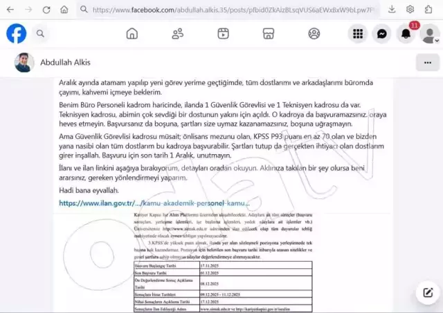 Şırnak Üniversitesi Rektörü Abdurrahim Alkış'ın kardeşi Abdullah Alkış, üniversitenin bir kişilik açtığı personel ilanının kendisi için olduğunu Facebook hesabından açık açık itiraf etti.