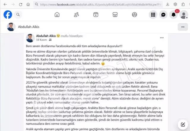 "BANA VE ABİME DÜŞMAN OLANLAR ÇATLAYACAK"Abdullah Alkış, kendisi için özel oda ve bilgisayar dahi hazırlandığını, işe alım sürecinde "prosedür" gereği ilan açıldığını, ancak aslında tüm planlamanın çok önceden yapıldığını söyledi. Abdullah Alkış'ın, 12 gün önce 18 Kasım Salı günü Facebook'tan yaptığı paylaşım şöyle: "Beni seven dostlarıma Facebook'umda ekli tüm arkadaşlarıma duyurulur!!! Bana ve abime düşman olanları çatlatacak şekilde üniversitede klimalı, bilgisayarlı, şahsıma özel odamda Büro Personeli olarak çalışmam için kadro ilanım dün itibarıyla yayınlandı. Merak etmeyin bu sefer her şeyi düşündük. Kadro benim için hazırlandı, ilan sadece kanun gereği prosedürdür, sıkıntı yok. Dualarınızı, tebriklerinizi şimdiden arayıp iletebilirsiniz, kabul ederim. Yakında üniversite konukevinde geçici olarak yaptığım görevden ayrılıyorum. Aralık ayında Rektörlük Dış İlişkiler Koordinatörlüğünde Büro Personeli olarak, doğrudan rektör abime bağlı şekilde görevime başlıyorum. Bu sefer hiçbir sorun yaşanmayacak inşallah.