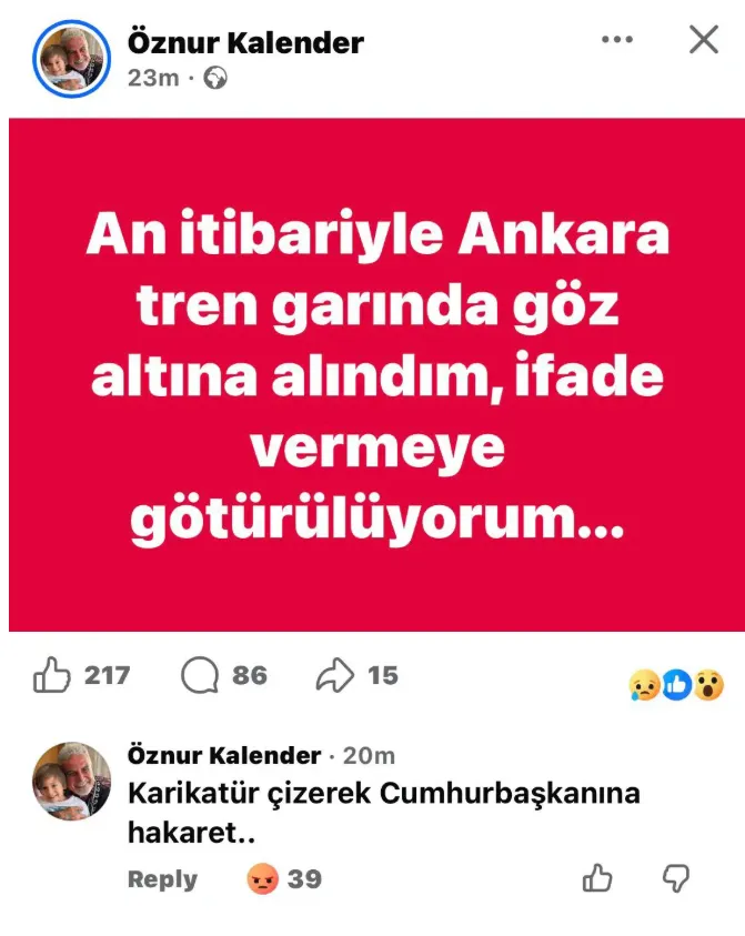"An itibarıyla Ankara Tren Garı'nda gözaltına alındım, ifade vermeye götürülüyorum... Karikatür çizerek Cumhurbaşkanına hakaret."
