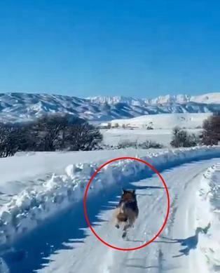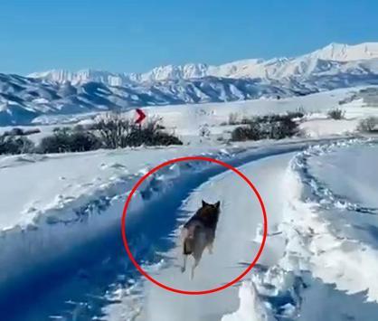 Karlı yolda paletli ambulansın önünden koşan kurt görüntülendi