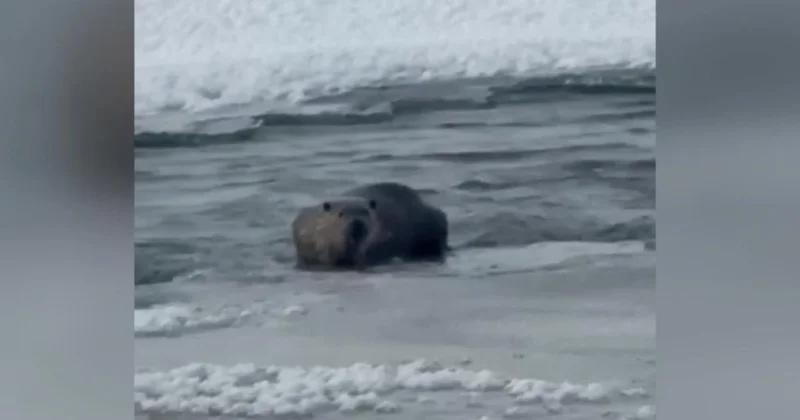 Kar üzerinde koşarak suya giren su samurları, cep telefonu kamerasıyla görüntülendi.