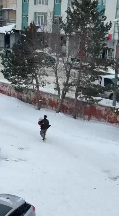 Kars'ta bir vatandaşın, rahatsızlanan annesin olumsuz hava şartlarına rağmen kucağında taşıyarak doktora götürdüğü anlar cep telefonu kamerasına yansıdı.
