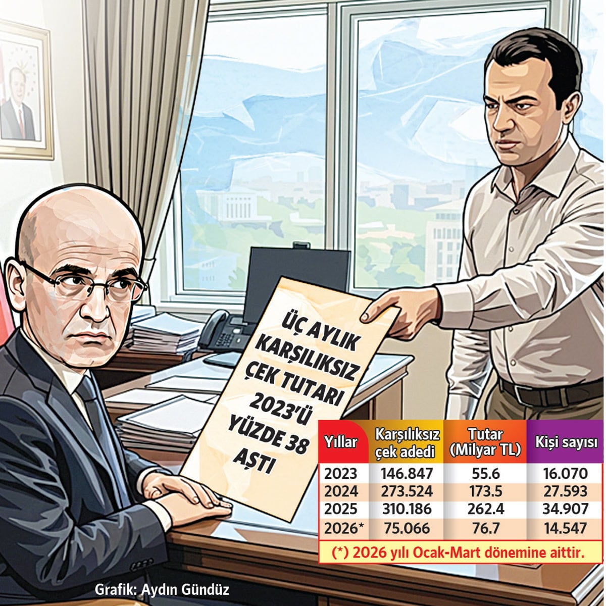 Türkiye Bankalar Birliği (TBB) Risk Merkezi’nin verilerine göre, 2023’te 146 bin 847 olan karşılıksız çek adedi, 2024’te 273 bin 524’e, 2025’te 310 bin 186’ya çıktı. 2026’da ise ocak, şubat ve mart aylarında 75 bin 66 adet çek karşılıksız çıktı.