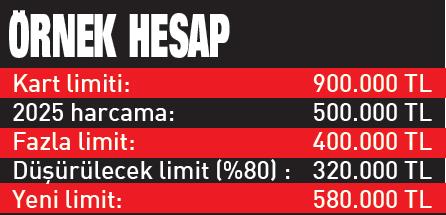 Limit azaltılması sonucu istisnanın altında kalan kartların limitleri yükseltilecek. Örneğin limit azaltımı sonrası 15 Şubat'ta 200 bin liraya düşen bir kart limiti bankaya başvurularak 400 bin liraya çıkartılabilecek.