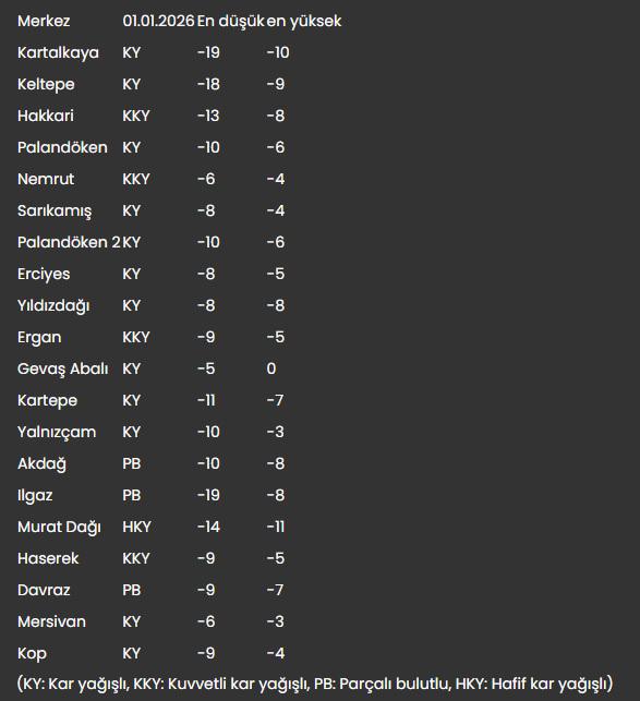 Bazı kayak merkezlerinde 1 Ocak 2026 tarihli hava sıcaklığı tahminleri de paylaşıldı.