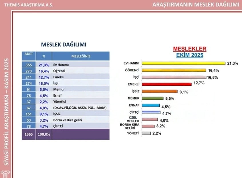 THEMİS, çalışmanın hata payını ±2,2 olarak açıklarken, araştırmaya katılanların meslek dağılımlarını da kamuoyuyla paylaştı.