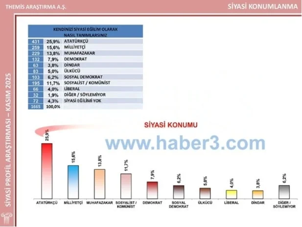 Öte yandan araştırmada katılımcılara "Kendinizi siyasi eğilim olarak nasıl tanımlarsınız?" sorusu da yöneltildi. Yurttaşın yüzde 25,9'unun kendisini Atatürkçü olarak tarif ettiği görüldü.