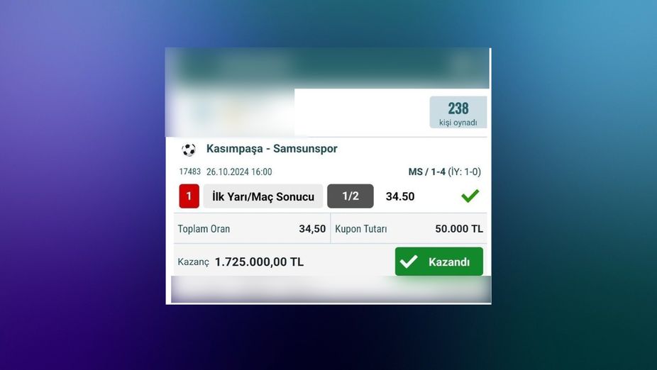 Oranı 34.50 olan bu bahse tam 50 bin TL yatırdığı ve 1 Milyon 725 bin TL kazandığı aynı kuponu ise 238 kişinin daha oynadığı belirtildi.