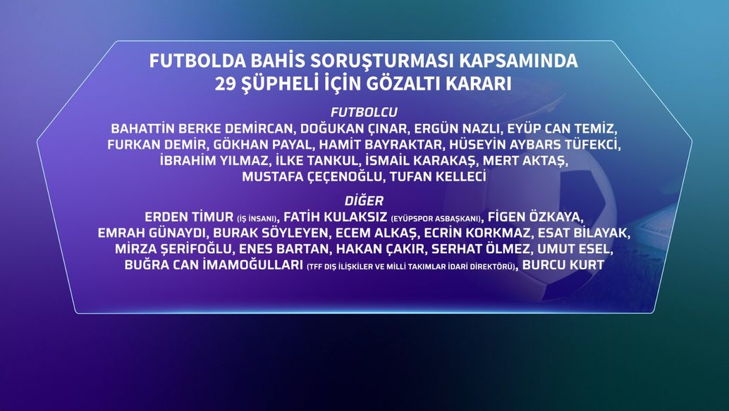 "Futbolda bahis" soruşturması kapsamında, aralarında eski Galatasaray Sportif AŞ Başkan Vekili Erden Timur'un da olduğu 29 şüpheli gözaltına alındı.