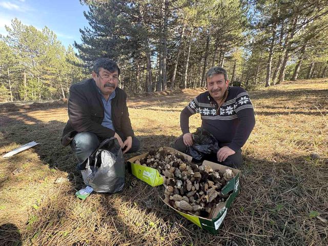 "EMEK VAR, PARAYLA ÖLÇMEMEK LAZIM"Saatler içerisinde 6 kilogram mantar topladıklarını ifade eden İbrahim Büyükacar, mantarın özellikleriyle ilgili bilgi vererek, "Toplanan mantarların rengi, altında yetiştiği çam ağacına göre siyah ya da beyaz olarak değişebilir. Rengi farklı olsa da ikisi de kuzugöbeği mantarı. Bugün şansımız yaver gitti, bu biraz da şans meselesi. Doğru yerlerde ararsanız, şansınız da varsa bulabilirsiniz. Sabah güneşinin vurduğu anlarda daha yoğun yetişir. Yanan ormanlık alanlarda daha fazla olur. Bizim ilçemizde çok şükür orman yangınları olmadı. Mantar bulabilmek için orman yangınlarına gerek yok. Bu da ispatıdır. Burada yaklaşık 6 kilogram mantar var. Bunu değeriyle ölçmemek lazım, burada emek var, parayla ölçmemek lazım. Biz yiyeceğiz" dedi.