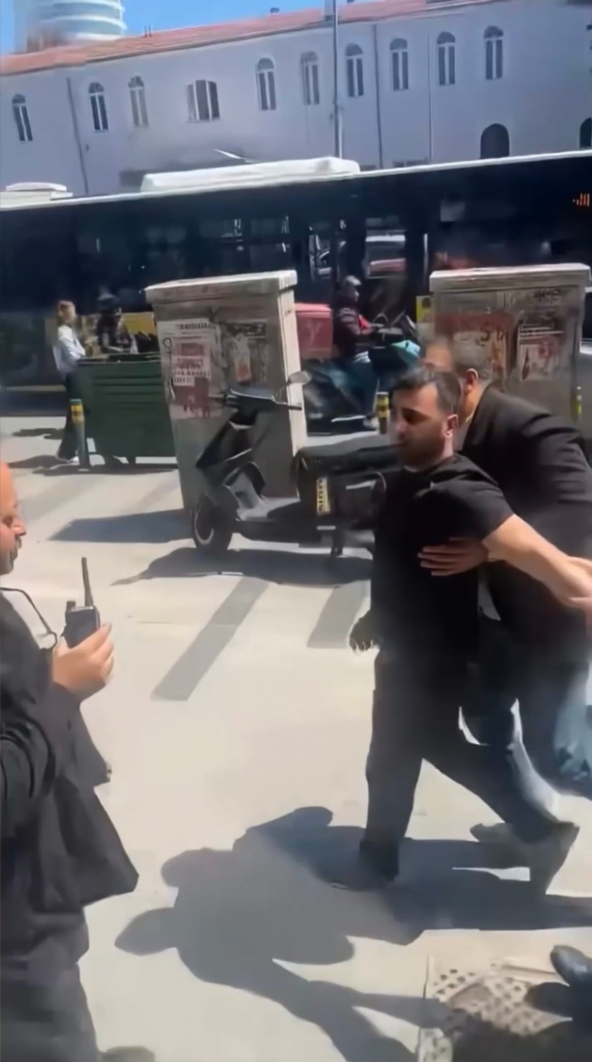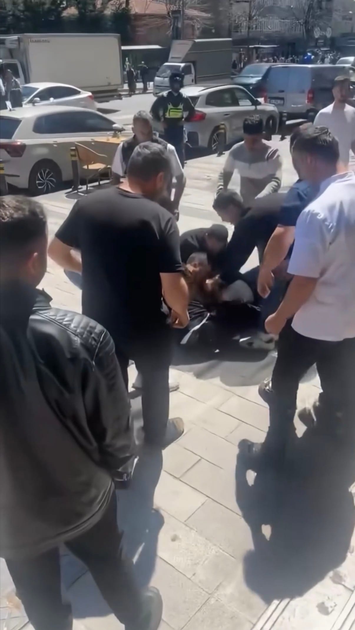 İşportacılar, esnafı yumruk ve tekmelerle darbetti. Çevredekiler kavga eden tarafları "Bir durun", "Sakin olun" diyerek sakinleştirmeye çalıştı.