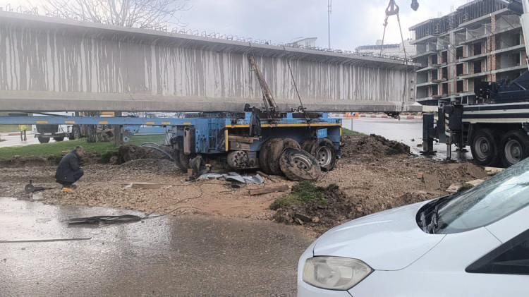 Siirt'te viyadük projesi için taşınan 50 metrelik dev beton kiriş, tırın dönüşü sırasında kavşakta takılı kaldı. Yolun tamamen kapandığı bölgede ekiplerin kurtarma çalışmaları sürüyor.