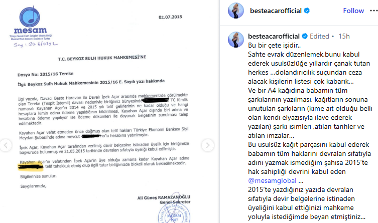 "Sahte evrak düzenlemek, bunu kabul ederek usulsüzlüğe yıllardır çanak tutan herkes… Dolandırıcılık suçundan ceza alacak kişilerin listesi çok kabarık.Ve bir A4 kağıdına babamın tüm şarkılarının yazılması, kağıtların sonuna unutulan şarkıların (kime ait olduğu belli olan kendi el yazısıyla ilave ederek yazılan) şarkı isimleri ,atılan tarihler ve atılan imzalar…Bu usulsüz kağıt parçasını kabul ederek babamın tüm haklarını devralan sıfatıyla adını yazmak istemediğim şahsa 2015’te hak sahipliği devrini kabul eden MESAM...