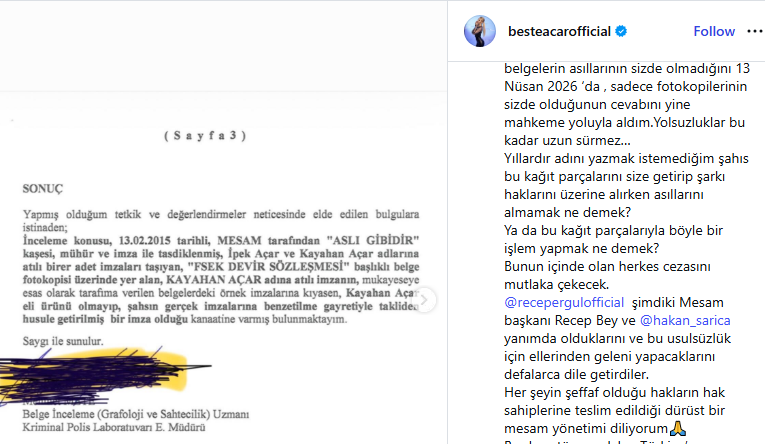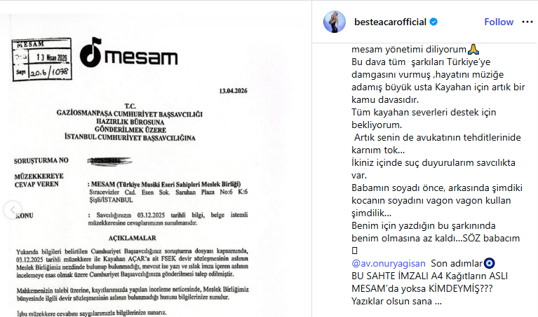 "İKİNİZ İÇİN DE SUÇ DUYURULARIM SAVCILIKTA VAR"Şimdiki MESAM başkanı Recep Bey ve Hakan Sarıca, yanımda olduklarını ve bu usulsüzlük için ellerinden geleni yapacaklarını defalarca dile getirdiler. Her şeyin şeffaf olduğu hakların hak sahiplerine teslim edildiği dürüst bir MESAM yönetimi diliyorum.Bu dava tüm şarkıları Türkiye’ye damgasını vurmuş, hayatını müziğe adamış büyük usta Kayahan için artık bir kamu davasıdır. Tüm Kayahan severleri destek için bekliyorum.Artık senin de avukatının tehditlerine karnım tok. İkiniz için de suç duyurularım savcılıkta var. Babamın soyadı önce, arkasında şimdiki kocanın soyadını vagon vagon kullan şimdilik…Benim için yazdığın bu şarkının da benim olmasına az kaldı… Söz babacım, son adımlar. Bu sahte imzalı a4 kağıtların aslı MESAM’da yoksa kimdeymiş? Yazıklar olsun sana."