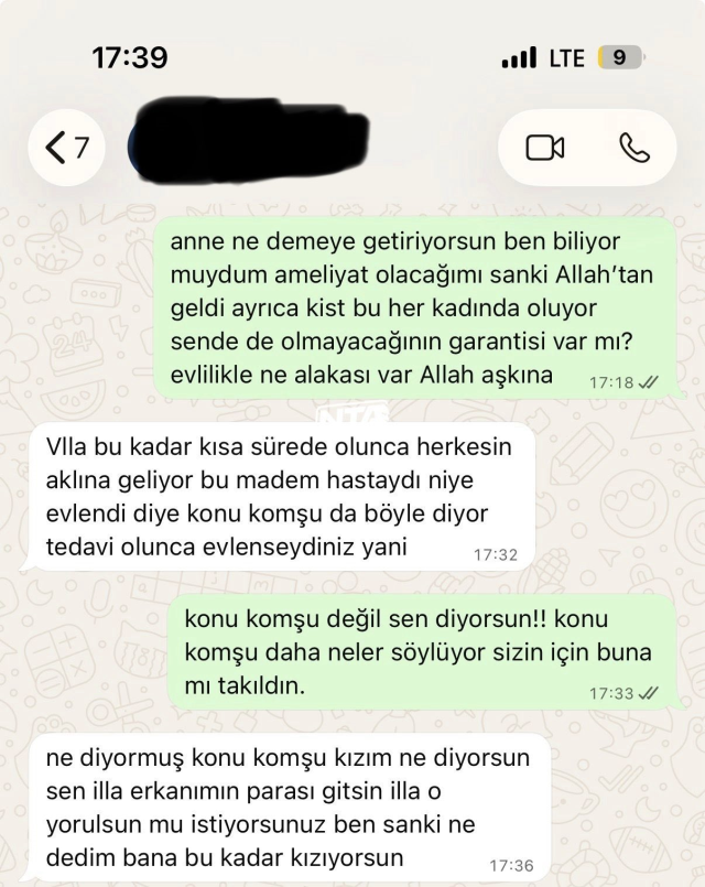 GELİNDEN SERT YANITGenç kadının ise mesajlara tepki gösterdiği görüldü. “Ben biliyor muydum ameliyat olacağımı, ayrıca kist bu her kadında oluyor, evlilikle ne alakası var” diyerek sağlık durumunun evlilikle ilişkilendirilmesine karşı çıktı. Tartışmanın ilerleyen kısmında ise “Konu komşu değil sen diyorsun” sözleriyle kaynanasına tepki gösterdi. Mesajların devamında kaynananın, “İlla Erkan’ımın parası gitsin, illa o yorulsun mu istiyorsunuz” şeklindeki ifadeleri de dikkat çekti.