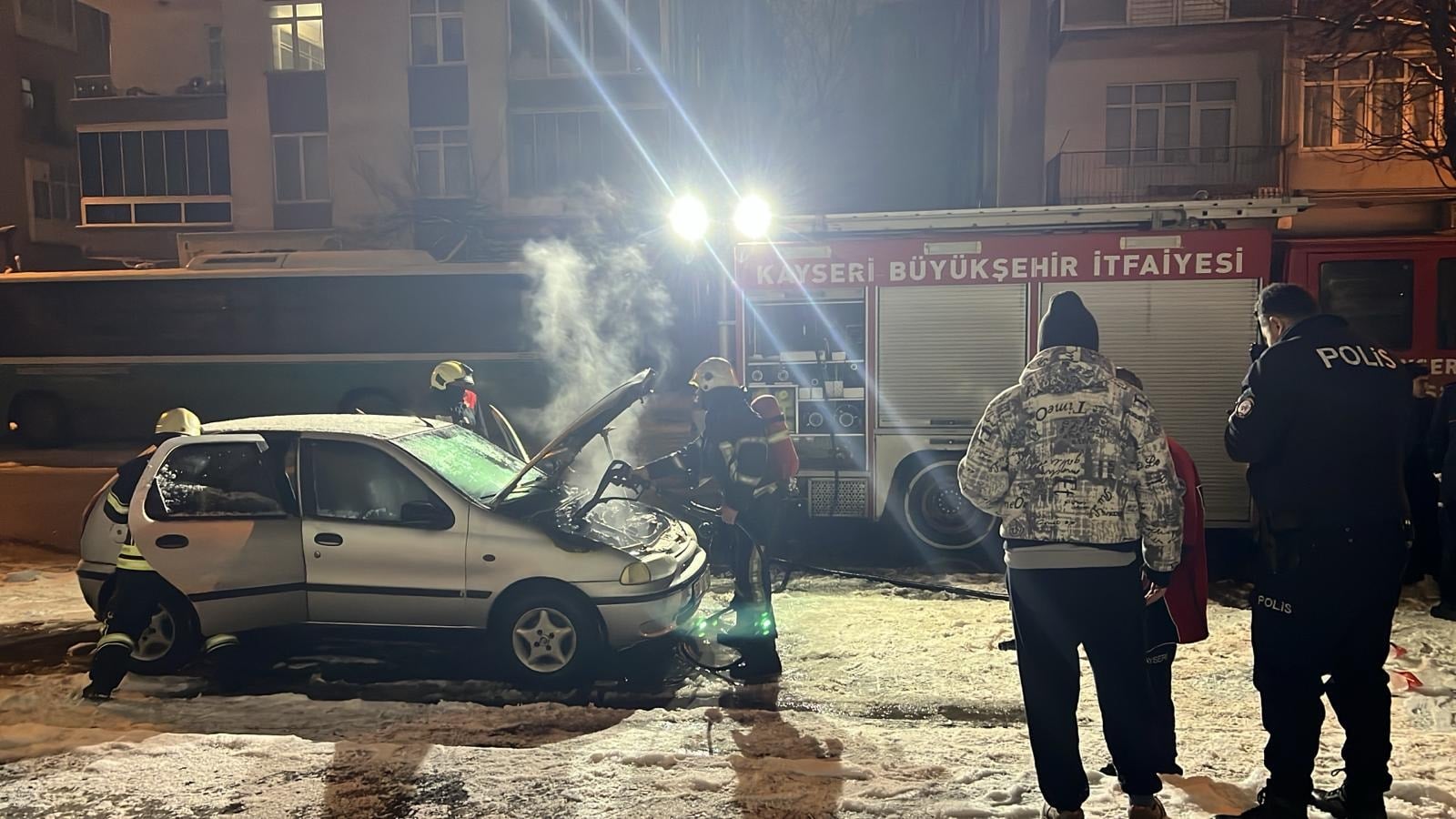 Bir süre aracın ısınmasını bekleyen sürücü, otomobilinin motor kısmından çıkan alevleri fark etti.