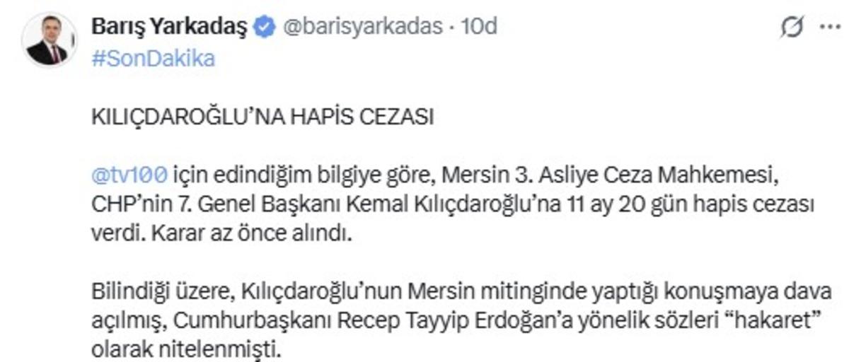 tv100'den Barış Yarkadaş'ın haberine göre Mersin 3. Asliye Ceza Mahkemesi, Kemal Kılıçdaroğlu’na 11 ay 20 gün hapis cezası verdi. Yarkadaş paylaşımında, "Bilindiği üzere, Kılıçdaroğlu’nun Mersin mitinginde yaptığı konuşmaya dava açılmış, Cumhurbaşkanı Recep Tayyip Erdoğan’a yönelik sözleri 'hakaret' olarak nitelenmişti." ifadelerini kullandı.