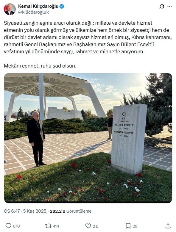 CHP eski Genel Başkanı Kemal Kılıçdaroğlu, Türk siyasetinde "Karaoğlan" lakabıyla anılan eski Başbakan ve CHP'nin 3'üncü Genel Başkanı Bülent Ecevit'in vefatının 19. yıl dönümünde kabirde çekilmiş fotoğrafına dikkat çeken bir not düştü.