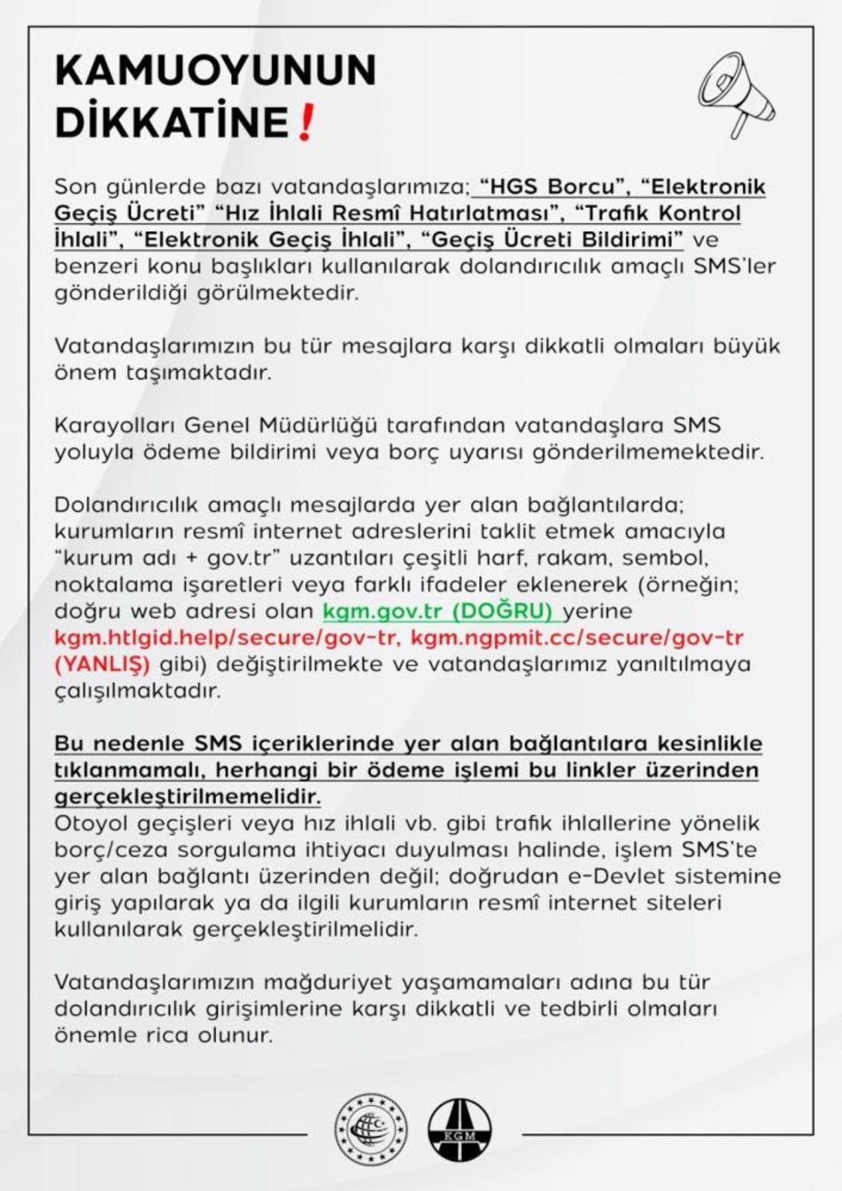 KGM'nin sosyal medya hesabından yapılan açıklamada, "Son günlerde bazı vatandaşlarımıza; 'HGS Borcu', 'Elektronik Geçiş Ücreti' 'Hız İhlali Resmî Hatırlatması', 'Trafik Kontrol İhlali', 'Elektronik Geçiş İhlali', 'Geçiş Ücreti Bildirimi' ve benzeri konu başlıkları kullanılarak dolandırıcılık amaçlı SMS'ler gönderildiği görülmektedir. Vatandaşlarımızın bu tür mesajlara karşı dikkatli olmaları büyük önem taşımaktadır. Karayolları Genel Müdürlüğü tarafından vatandaşlara SMS yoluyla ödeme bildirimi veya borç uyarısı gönderilmemektedir" ifadelerine yer verildi.
