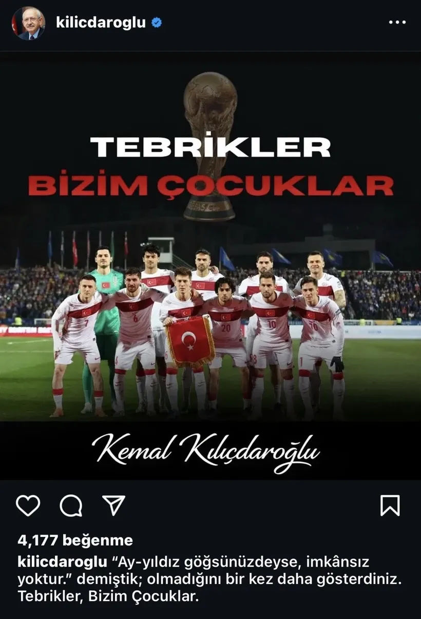 2026 FIFA Dünya Kupası Avrupa Elemeleri play-off finalinde Kosova'yı 1-0 yenerek Dünya Kupası bileti alan A Milli Futbol Takımı'na tüm çevrelerden tebrik yağarken, en dikkat çeken paylaşımlardan biri ise CHP eski Genel Başkanı Kemal Kılıçdaroğlu'ndan geldi.