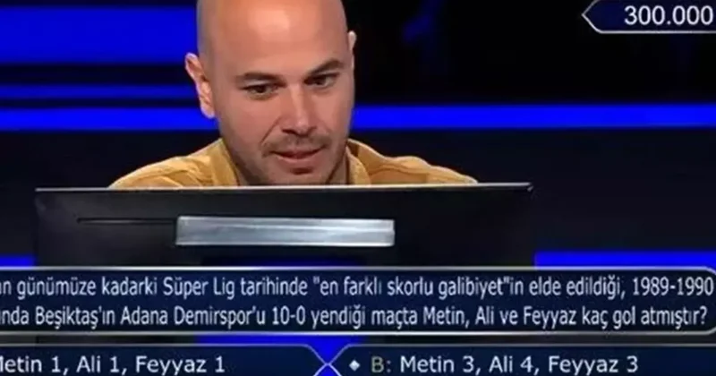 300 BİN LİRA DEĞERİNDEKİ BEŞİKTAŞ SORUSUProgramda yarışmacıya yöneltilen 300 bin lira değerindeki soru şu şekildeydi: "1959'dan günümüze kadarki Süper Lig tarihinde 'en farklı skorlu galibiyetin elde edildiği', 1989-1990 sezonunda Beşiktaş'ın Adana Demirspor'u 10-0 yendiği maçta Metin, Ali ve Feyyaz kaç gol atmıştır?"