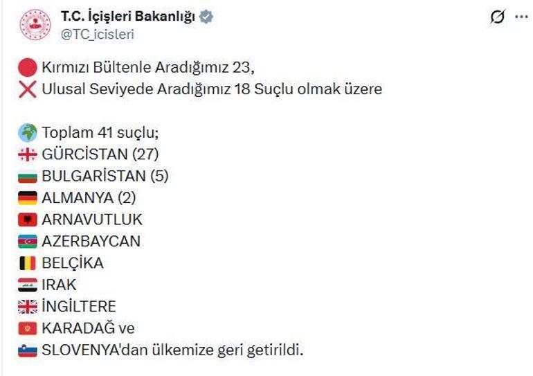 Bakanlığın sanal medya hesabından yapılan açıklamada, Emniyet Genel Müdürlüğü ekipleri ve Adalet Bakanlığı görevlilerinin yurt dışına kaçan ve haklarında arama kararı bulunan şüphelilerin izini titizlikle sürdüğü belirtildi. İlgili ülkelerin kolluk birimleriyle yürütülen ortak iş birliğiyle yakalanan şüphelilerin Türkiye'ye iadeleri sağlandığı ifade edilerek, şöyle denildi: "Kırmızı bültenle aradığımız 23, ulusal seviyede aradığımız 18 suçlu olmak üzere toplam 41 suçlu; Gürcistan (27), Bulgaristan (5), Almanya (2), Arnavutluk, Azerbaycan, Belçika, Irak, İngiltere, Karadağ ve Slovenya'dan Türkiye geri getirildi. Kırmızı bültenle uluslararası seviyede arananlar B.K., S.D., M.K., U.K., A.K.Ç., H.C., G.K.Ö.D., M.K., B.Y., R.A., D.K., T.G., H.K., R.K.S., E.O., A.G., Ü.D., T.S., B.A., S.A., R.R., S.K., Ö.G. ile ulusal seviyede arananlar E.Z., Y.Ş., M.Ş.A., M.H.A., M.E.K., H.K., Y.Y., Ü.K., V.T., K.A., U.A., S.A.M., K.A., U.Ö., Ö.G., Ü.Ö., M.Z., M.C. yakalanarak iadeleri sağlandı. Emeği geçen daire başkanlıklarımızı ve kahraman polislerimizi tebrik ediyoruz."