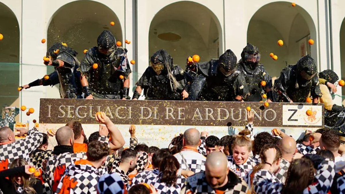 TORİNO'YA BİR SAAT UZAKLIKTAKİ KASABA DİKKAT ÇEKİYORTorino'ya bir saat uzaklıktaki Ivrea kasabası, dünyanın en ilginç geleneklerinden biri olan "Portakal Savaşı"na ev sahipliği yapıyor. Ortaçağ isyanını temsil eden bu devasa yemek savaşında, binlerce kişi birbirine portakal fırlatıyor.
